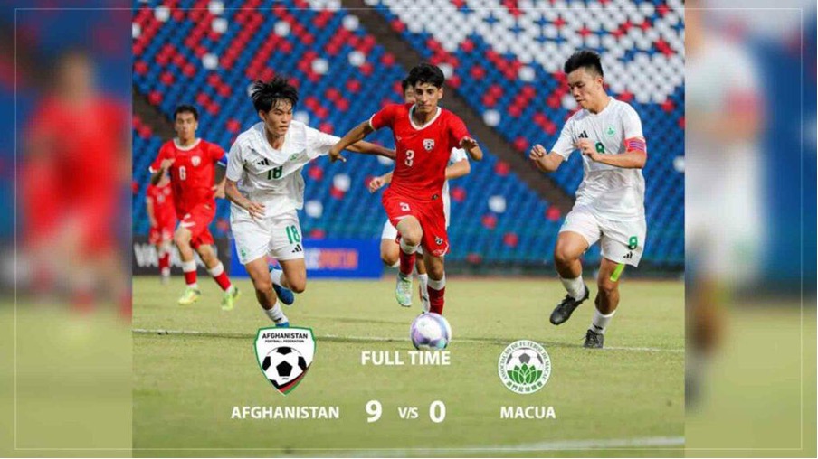 Afghanistan trounced Macau 9-0 in their second match at the Central Asian Football Association (CAFA) Under-17 Championship qualifiers on Wednesday.