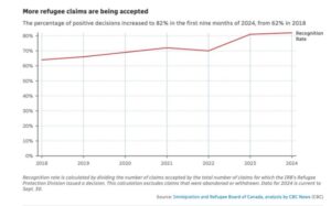 The recognition rate, which is determined by the number of accepted refugee claims divided by the total number of claims that have been decided by the Immigration and Refugee Board on merit, also increased to 82 per cent in the first nine months of 2024, from 64 per cent in 2018.
