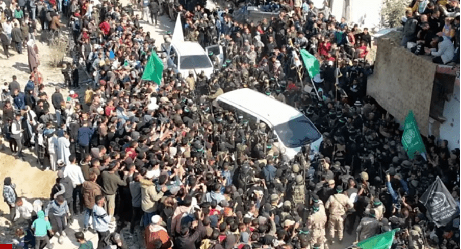 Earlier, in Jabalia in northern Gaza, an Israeli soldier, Agam Berger, wearing an olive green uniform, was led through a narrow alley between heavily damaged buildings and over piles of rubble before being handed to the Red Cross.