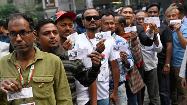 Citizens lined up in long queues at polling stations to participate in the elections, which are being held following the removal of Sheikh Hasina after the 2024 student uprising.