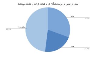از میان همۀ این خانوادههای بیجاشده نزدیک به ۳۱ درصد در هرات و بیش از ۲۱ درصد آنان در هلمند هستند و متباقی آنها در ۲۸ ولایت دیگر قرار دارند. زمینلرزه در هرات و خشکسالی در هلمند بیشتر از عوامل بیجاشدهگی این خانوادهها است.