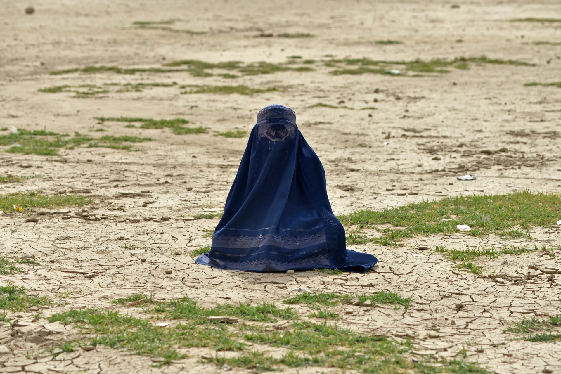 FEATURED IMAGE: A burqa-clad woman sits in a field where a special prayer for rain is being performed by Afghan Muslims, in Fayzabad district of Badakhshan Province on May 19, 2025. (Photo by OMER ABRAR/AFP via Getty Images)