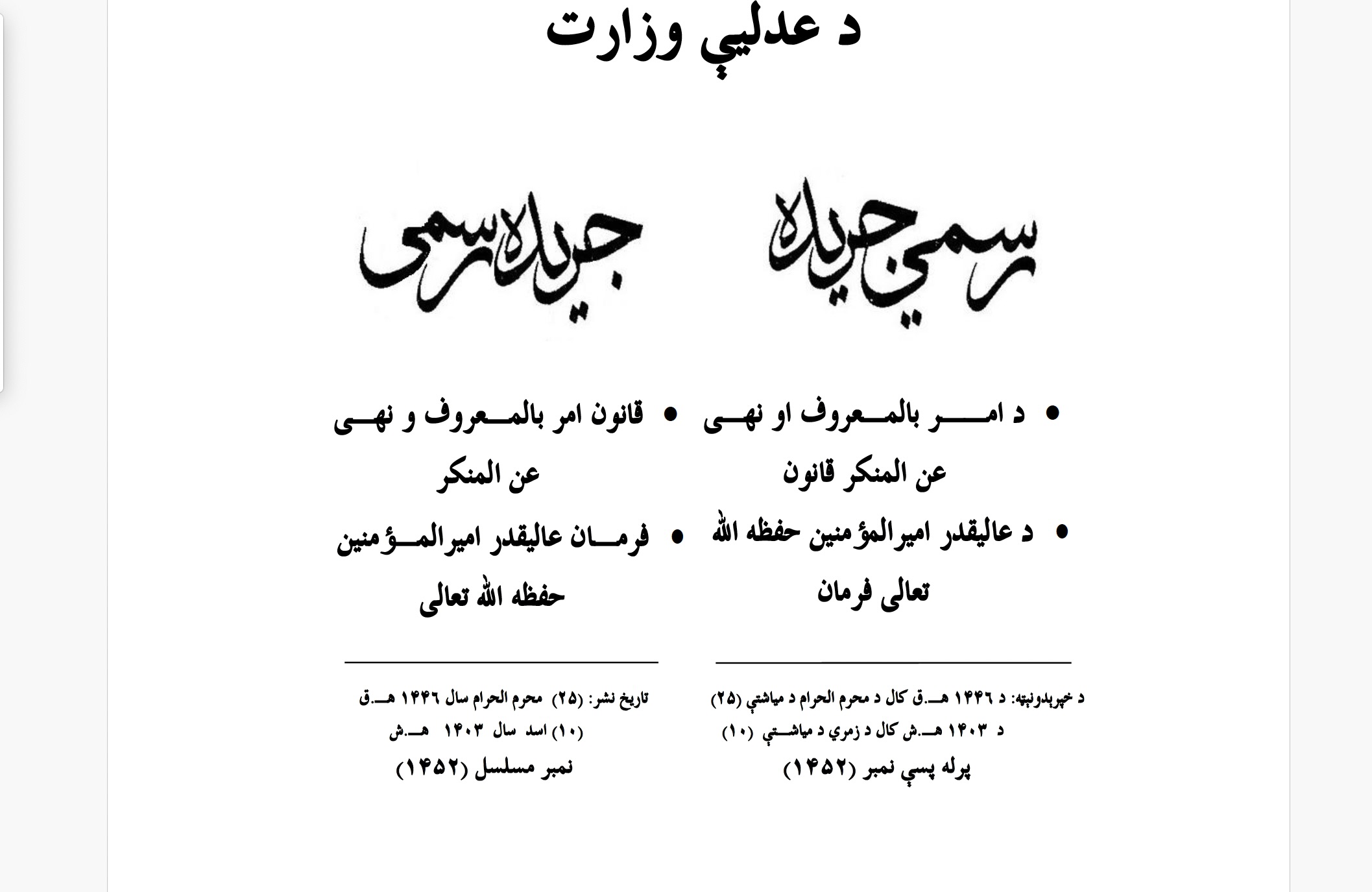 د طالبانو د حکومت عدلیې وزارت د زمري په ۳۱ اعلان وکړ چې د ملا هبت الله اخندزاده د فرمان پر بنسټ جوړ شوی د امر بالمعروف او نهې عن‌المنکر قانون، په یوه مقدمه، ۴ فصلونو او ۳۵ مادو کې توشېح شوی دی او اوس په رسمي جريده کې له خپرېدو وروسته د پلي کېدو وړ دی.