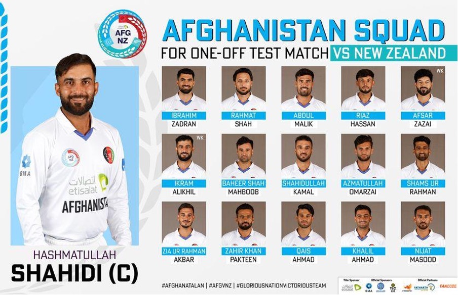 د افغانستان کرکټ بورډ پر خپله فېسبوکپاڼه لیکلي، د کرکټ بورډ غوراوي کمېټې د نیوزیلېنډ پر وړاندې د یوازېنۍ ټېسټ لوبې لپاره نوملړ غوره کړ چې له مخې یې ۱۶ کسیز نوملړ د لوبغاړو د ځلېدو او کارکردګۍ پر بنسټ نهایي شوی دی.