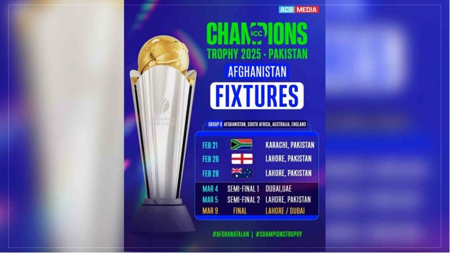د کرکټ نړۍوالې شورا له لوري د ۲۰۲۵ کال د چمپینز ټرافي سیالیو مهالوېش په ډاګه شو چې له مخې به یې افغان لوبډله خپله لومړۍ لوبه د فبروري په ۲۱مه د سوېلي افریقا له لوبډلې سره ترسره کړي.