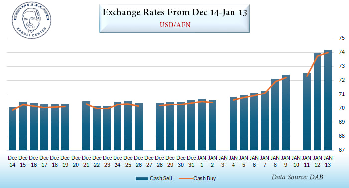 له يوى اونۍ راهیسې افغانۍ د ډالرو په وړاندې له يو لړ بدلونونو سره مخ شوى ده چى د افغانۍ په ارزښت کى د پام وړ کموالى راغلى ده، د مجید زابلي د اقتصادي څیړنو او پالیسۍ تحلیل مرکزد ګراف ډيټا ته په کتو سره په تيره يوه مياشت کى د افغانۍ ازرښت د ډالرو په وړاندې د شاوخوا ۷۰ افغانيو تر منځ ثابت پاتی وو چى وروسته د همدى اونۍ په لړ کى ۷۴ افغانیو ته لوړ شوى دى.