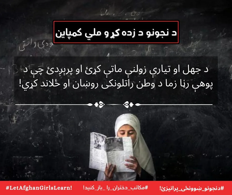 تر کومه چې د افغانستان ولس او جيد ديني عالمان د اسلام  پر سپېڅلو احکامو پوهېږې، د علم زده کړه پر نر او ښځې فرض ده، خو له بده مرغه دا درېيم  کال دی چې د طالبانو حکومت د نجونو پر مخ د ښوونځيو دروازې تړلې دي. څرنګه چې له دوی سره پدې برخه کې هېڅ ډول اسلامي دليل نشته، نو کله د عنعناتو پلمه کوي، کله د مناسب چاپېريال او کله هم د اسلامي نصاب او نوې طرحې خبره کوي.
